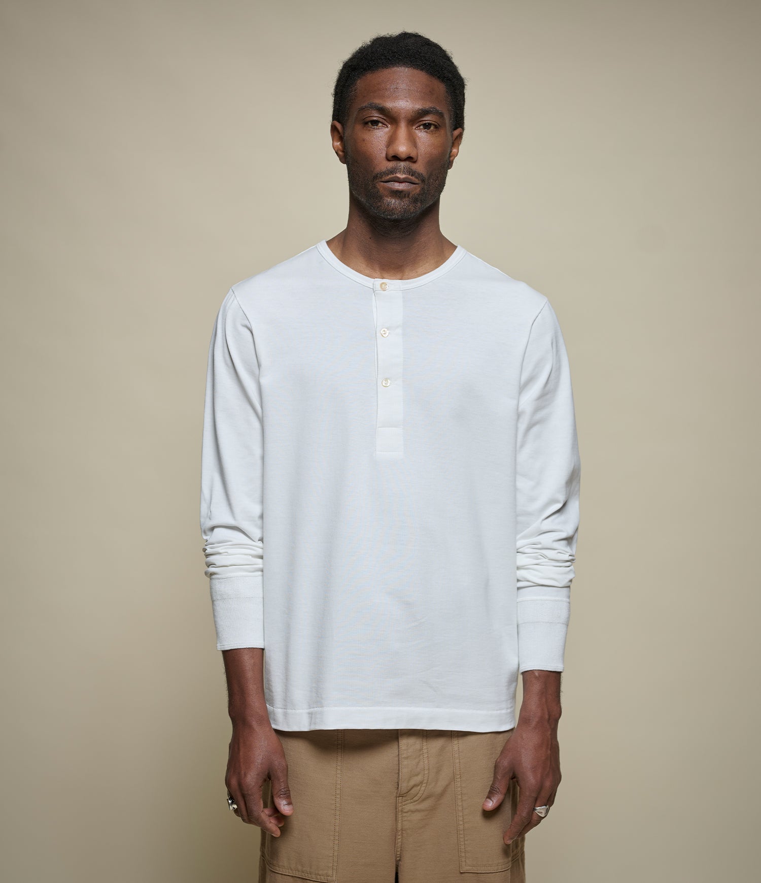 Im 14 oz. ist das Kult-T-Shirt größendurchsortiert erhältlich - so wie seine Fellow-Tees: das 207 Kurzarm- und 206 Langarm-Shirt aus 2-fädiger Biobaumwolle mit Knopfleiste und Flachstrickbündchen sowie das 1950’s Long- und Short-Sleeve, leicht und luftig einfädig gewirkt.
